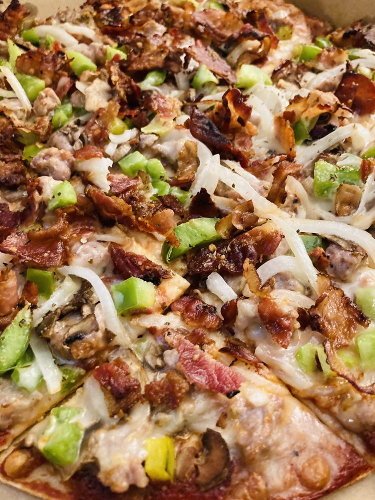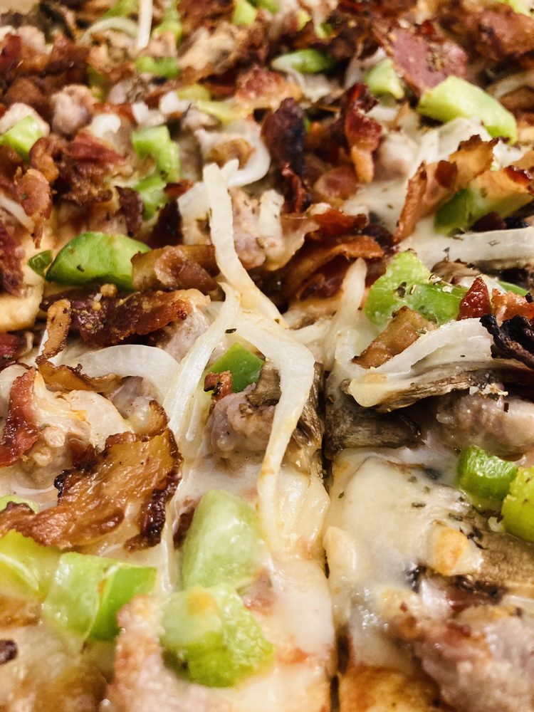 a combination of sausage, mushrooms, onions, green pepper and bacon. a true delight for any pizza lover!